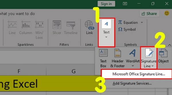 - Bước 1: Tại file Excel mà bạn đang cần chèn chữ ký, bạn nhấn vào tab Insert > Tiếp tục nhấn vào mục Text > Signature Line > Bạn chọn Microsoft Office Signature Line.