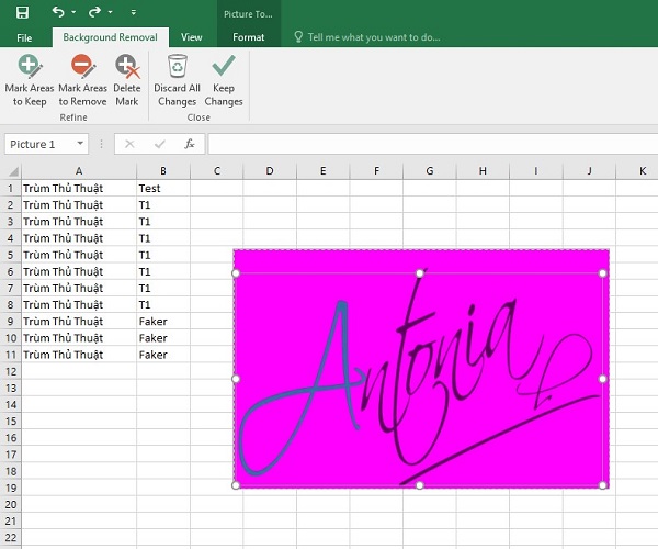 Với những hình chữ ký có nền sáng và rõ nét, bạn có thể dễ dàng loại bỏ nền trực tiếp trong Excel. Trước hết, chèn ảnh chữ ký vào bảng tính bằng cách vào Insert > Pictures như hướng dẫn. Tiếp theo, nhấp vào ảnh và mở tab Picture Format, chọn Remove Background. Lúc này, Excel sẽ tự động tô vùng nền màu hồng để nhận diện phần cần xóa. Bạn có thể dùng các công cụ Mark Areas to Keep để giữ lại nét chữ và Mark Areas to Remove để loại bỏ vùng nền thừa. Khi hoàn tất, chọn Keep Changes để áp dụng.