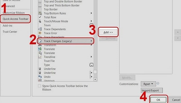 - B2: Ở cửa sổ mới hiển thị, bạn nhấn bạn nhấn Quick Access Toolbar > Tiếp tục chọn Track Changes > Sau đó chọn Add > Nhấn OK để lưu lại.