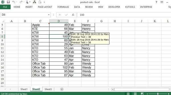 Sau khi đã cài đặt Track Change thì tất cả các thay đổi, chỉnh sửa trên bảng tính của bạn sẽ được đánh dấu ký hiệu nhỏ ở chính ô thao tác. Muốn xem lịch sửa trong file thì người dùng rê chuột đến đó, thông tin lịch chỉnh sửa sẽ hiển thị ngay bên cạnh.