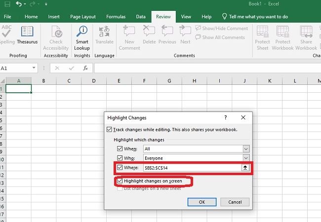 - Where > Trong trường hợp bạn chọn theo dõi trong toàn bộ trang tính thì cần tick vào ô “Highlight changes on Screen”. Trường hợp bạn chỉ muốn theo dõi thay đổi trong một phần của trang tính thì chọn Where và chọn phạm vi ô cần theo dõi là được nhé!