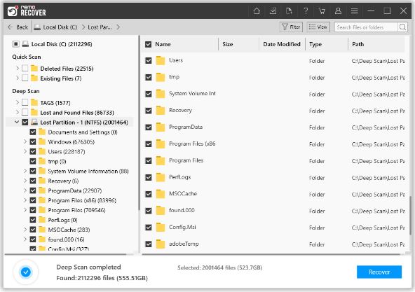 Sau khi các phân vùng đã được quét thì các dữ liệu đã phục hồi sẽ được hiển thị > Bạn chọn những tập tin exe đã xóa > Nhấn Recover để khôi phục là xong.
