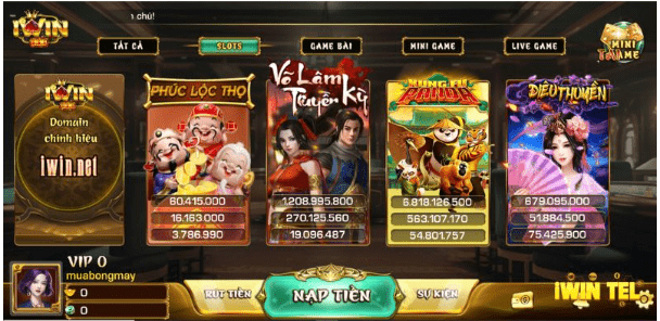 - Cụ thể Iwin Club mang đến cho người chơi 4 lựa chọn với các tựa: Điêu thuyền, Kung Fu Panda, Phúc Lộc Thọ, và đặc biệt là tựa game đang rất sốt trên thị trường hiện nay là Võ Lâm Truyền Kỳ.