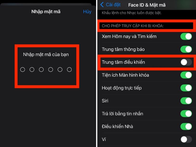 - B2: Tiến hành nhập mật mã của bạn > Tìm đến mục Cho phép truy cập khi bị khóa (Allow Access When Locked) > Bạn tắt mục Trung tâm điều khiển đi là xong.