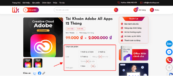 - Bước 2: Chọn phân loại sản phẩm cần mua, hiện nay Woku Shop đang cung cấp các loại tài khoản Adobe như sau: 1 thiết bị (Ultraview Login), 2 và 5 thiết bị sẽ được cấp tài khoản.