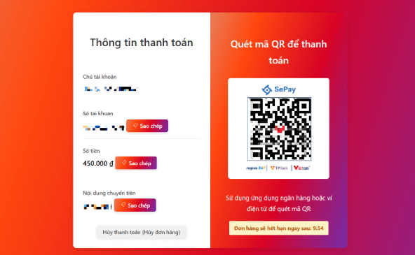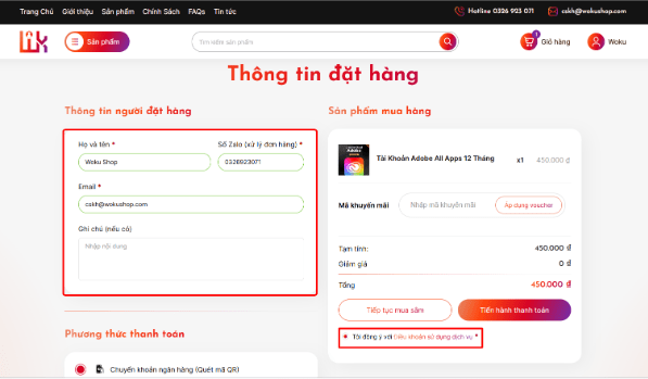 - Bước 4: Tại màn hình thanh toán, sẽ hiển thị mã QR thanh toán trực tiếp, bạn chỉ cần quét mã và xác nhận thanh toán. Sau đó bộ phận CSKH sẽ chủ động liên hệ với bạn để cung cấp tài khoản Adobe.