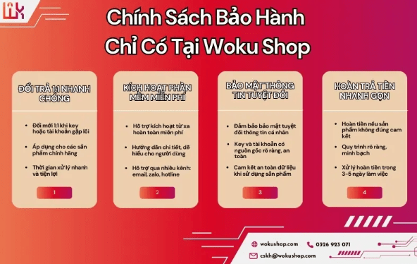 - Cam kết bảo mật thông tin tuyệt đối: Trong quá trình bảo hành và đổi trả, Woku Shop đảm bảo bảo mật thông tin và dữ liệu cá nhân của khách hàng, giúp bạn yên tâm khi sử dụng dịch vụ.