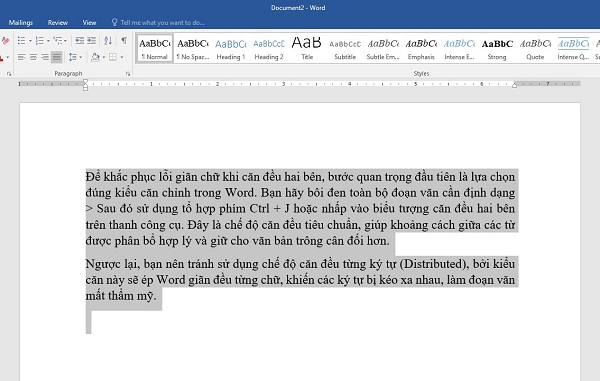 Ngược lại, bạn nên tránh sử dụng chế độ căn đều từng ký tự (Distributed), bởi kiểu căn này sẽ ép Word giãn đều từng chữ, khiến các ký tự bị kéo xa nhau, làm đoạn văn mất thẩm mỹ.