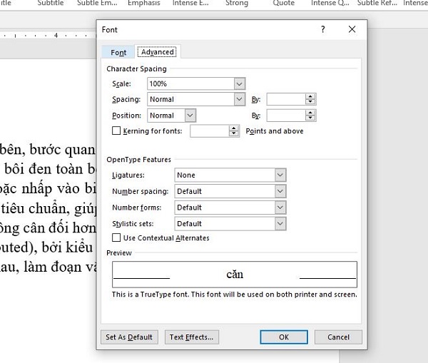 Nếu văn bản vẫn còn hiện tượng chữ bị giãn dù đã căn chỉnh đúng, rất có thể khoảng cách ký tự đang bị thay đổi. Trước tiên, bạn hãy bôi đen đoạn văn đang gặp lỗi. Tiếp theo, nhấn Ctrl + D để mở cửa sổ Font, rồi chuyển sang tab Advanced. Tại đây, tìm đến mục Spacing và chọn Normal, đồng thời kiểm tra Scale đang ở mức 100%. Sau khi hoàn tất, nhấn OK để áp dụng bạn nhé! Thao tác này sẽ đưa khoảng cách giữa các chữ về trạng thái mặc định, giúp đoạn văn hiển thị tự nhiên và dễ nhìn hơn.