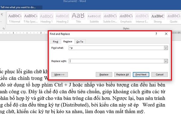 Một trong những nguyên nhân phổ biến khiến chữ bị giãn khi căn đều hai bên là thói quen nhấn Enter để xuống dòng thủ công. Khi gặp các dòng bị ngắt như vậy, Word sẽ cố kéo giãn khoảng cách giữa các chữ để lấp đầy chiều rộng, khiến văn bản trông rất thiếu tự nhiên. Để khắc phục, bạn có thể sử dụng chức năng thay thế nhanh bằng cách nhấn Ctrl + H, nhập ^p vào ô tìm kiếm và thay thế bằng một dấu cách, sau đó chọn Replace All. Sau khi thực hiện, văn bản sẽ tự động xuống dòng theo đúng chuẩn, giúp khoảng cách chữ trở lại cân đối và dễ đọc hơn.