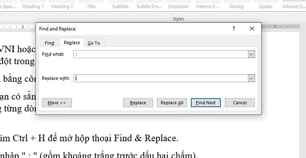 Trong trường hợp bạn có sẵn một tài liệu dài với nhiều lỗi dấu hai chấm bị cách, thay vì sửa thủ công từng dòng, hãy tận dụng chức năng Find & Replace của Word:
