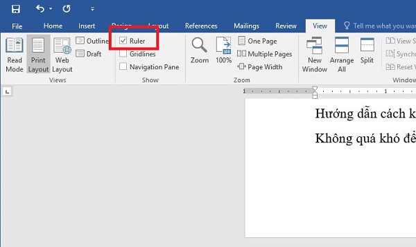 - Bước 2: Trong nhóm Show (Hiển thị), bạn đánh dấu vào ô Ruler (Thước kẻ).
