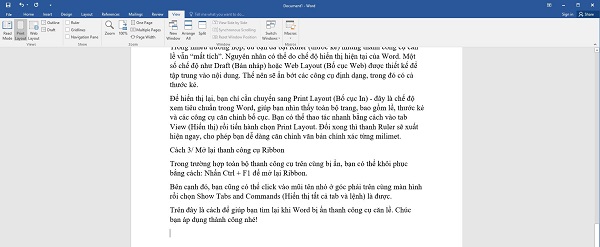 Để hiển thị lại, bạn chỉ cần chuyển sang Print Layout (Bố cục In) – đây là chế độ xem tiêu chuẩn trong Word, giúp bạn nhìn thấy toàn bộ trang, bao gồm lề, thước kẻ và các công cụ căn chỉnh bố cục. Bạn có thể thao tác nhanh bằng cách vào tab View (Hiển thị) rồi tiến hành chọn Print Layout. Đổi xong thì thanh Ruler sẽ xuất hiện ngay, cho phép bạn dễ dàng căn chỉnh văn bản chính xác từng milimet.