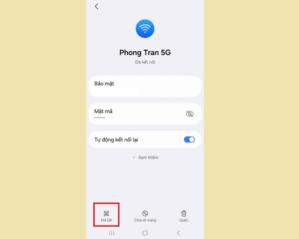 - B3: Nhấn chọn mã QR > Nhập mật khẩu/mã PIN điện thoại hoặc dấu vân tay của bạn > Mã QR sẽ hiển thị > Máy của người khác muốn kết nối wifi này thì chỉ cần quét mã QR là được.