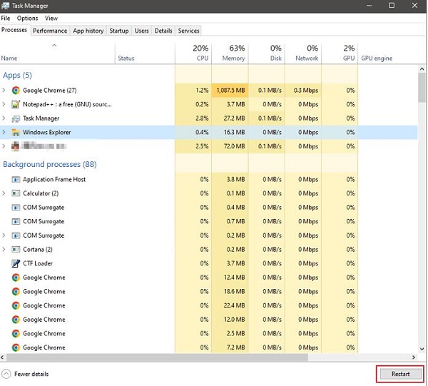 Một giải pháp đơn giản nhưng cũng khá hữu ích nếu như bạn gặp phải thông báo “Verify item location and try again”. Đối với thủ thuật này thì bạn nhấn tổ hợp phím Ctrl+Alt+Delete và nhấn chọn Task Manager > Sau đó, bạn nhấn vào tab Processes > Nhấn chọn vào dòng Windows Explorer > Nhấn nút Restart. Thực hiện xong thì xóa tệp lại lần nữa xem thử lỗi có tiếp tục xảy ra không nhé!