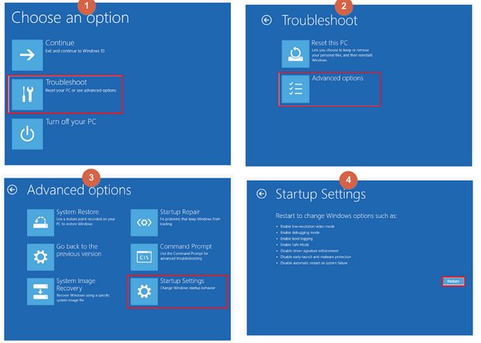 - B2: Sau đó, bạn điều hướng theo đường dẫn Troubleshoot > Advanced options > Startup Settings > Restart.